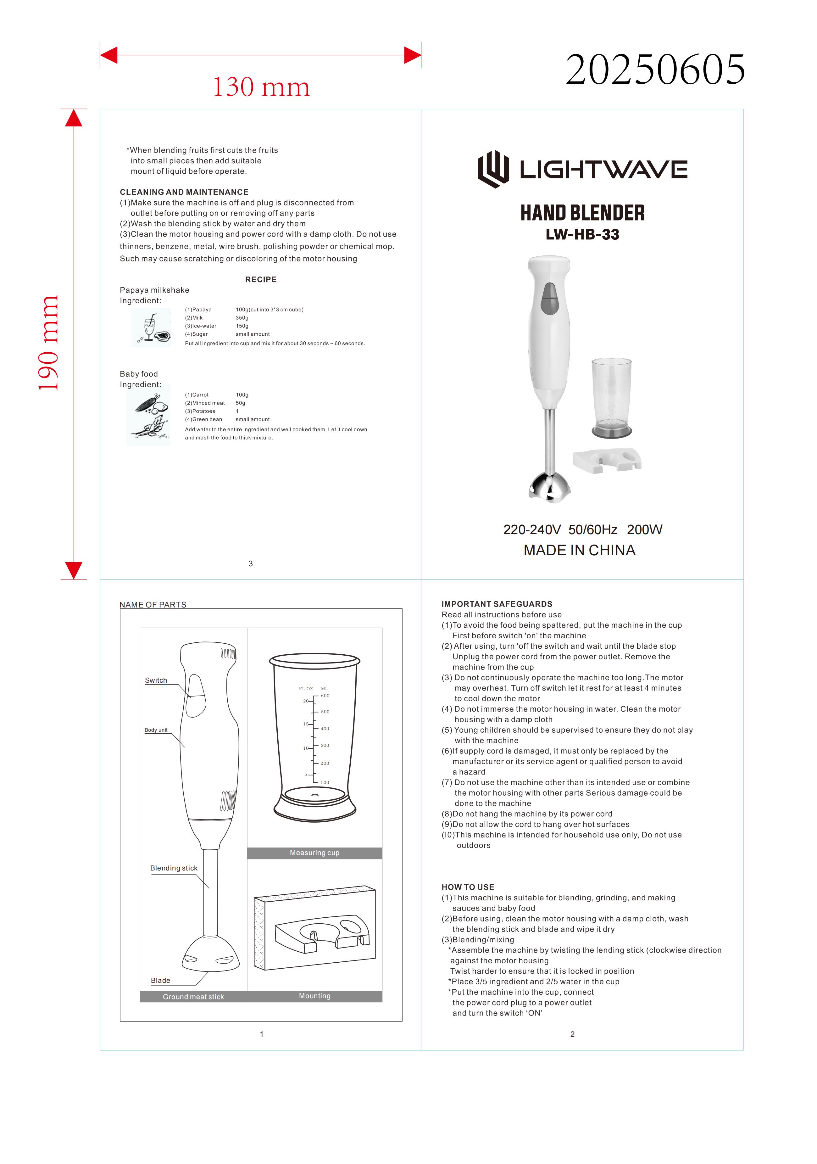 Made from BPA-free, food-safe materials, the LW-HB-33 is designed to ensure safety and health in food preparation. Its detachable blending shaft makes cleaning quick and easy, saving time after cooking. Compact in size, the blender is easy to store and does not take up much counter space, making it ideal even for smaller kitchens.
